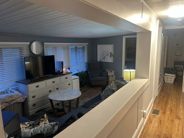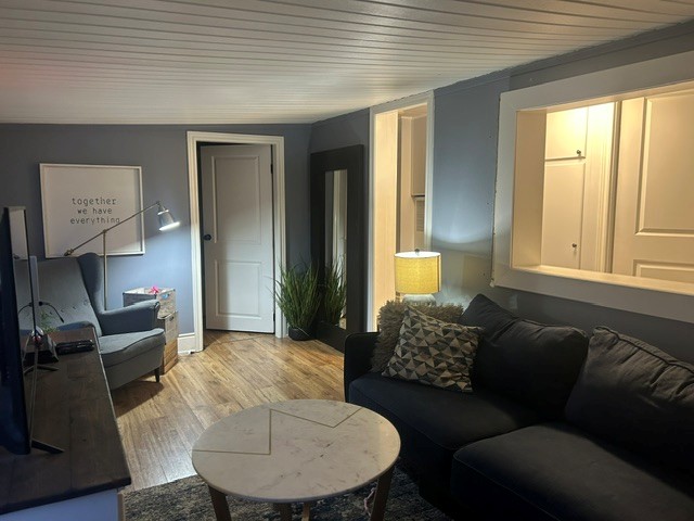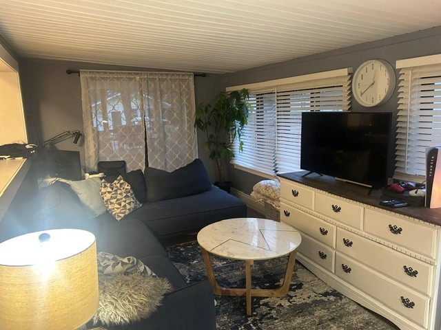 Lakeview 1 bedroom trailer (486 sq.ft.) with furniture  in semi-open living room concept. 24 ft,deck with lake view.